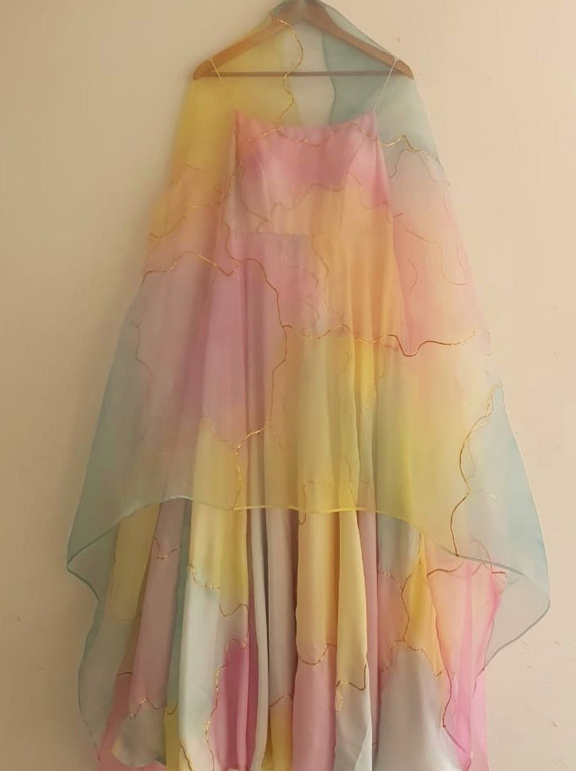 Hand painted pastel shades of powder pink, power blue and lemon all over a pure silk flaired kurta and organza duppata enhanced with hand embroidered gota.