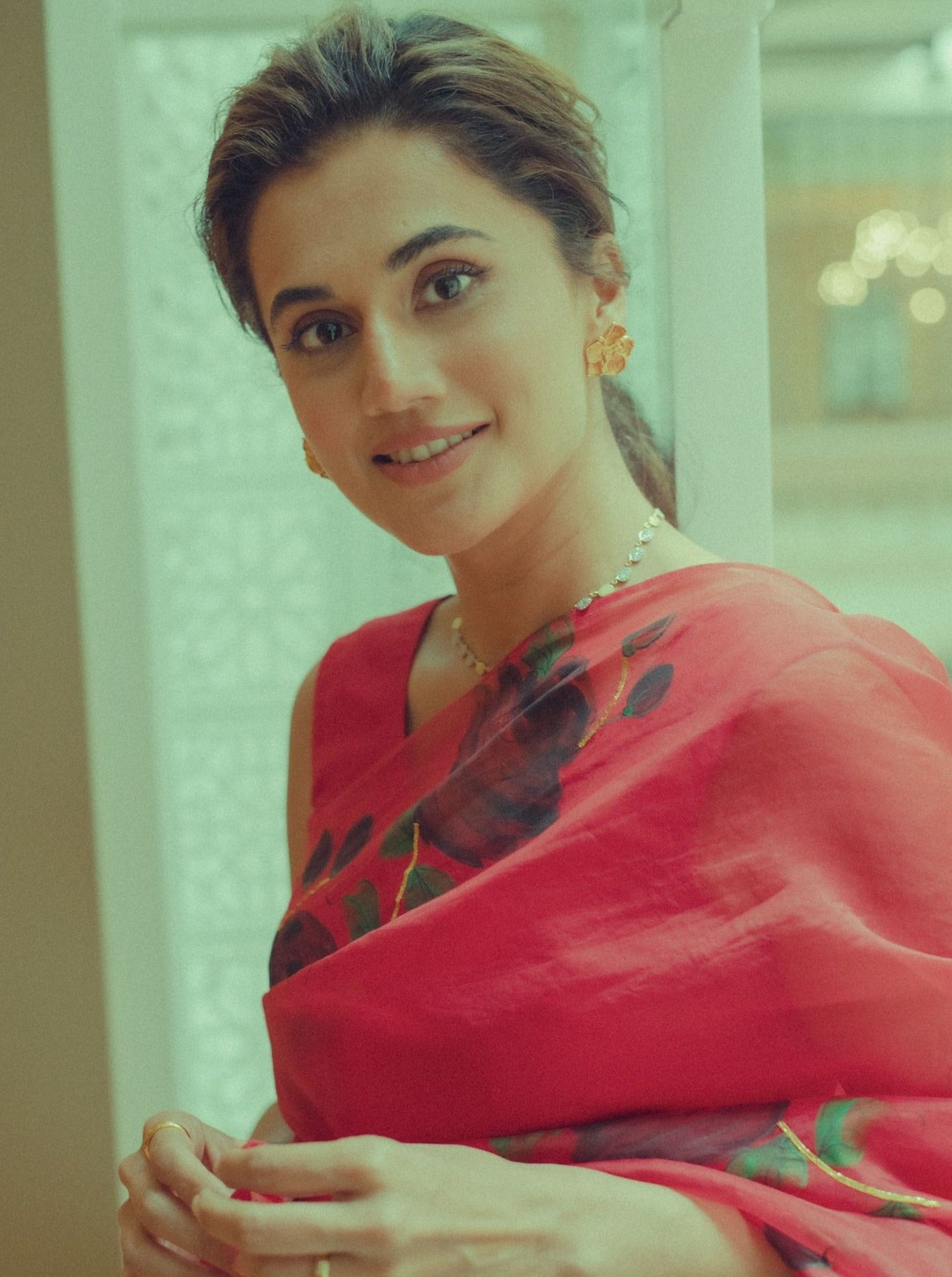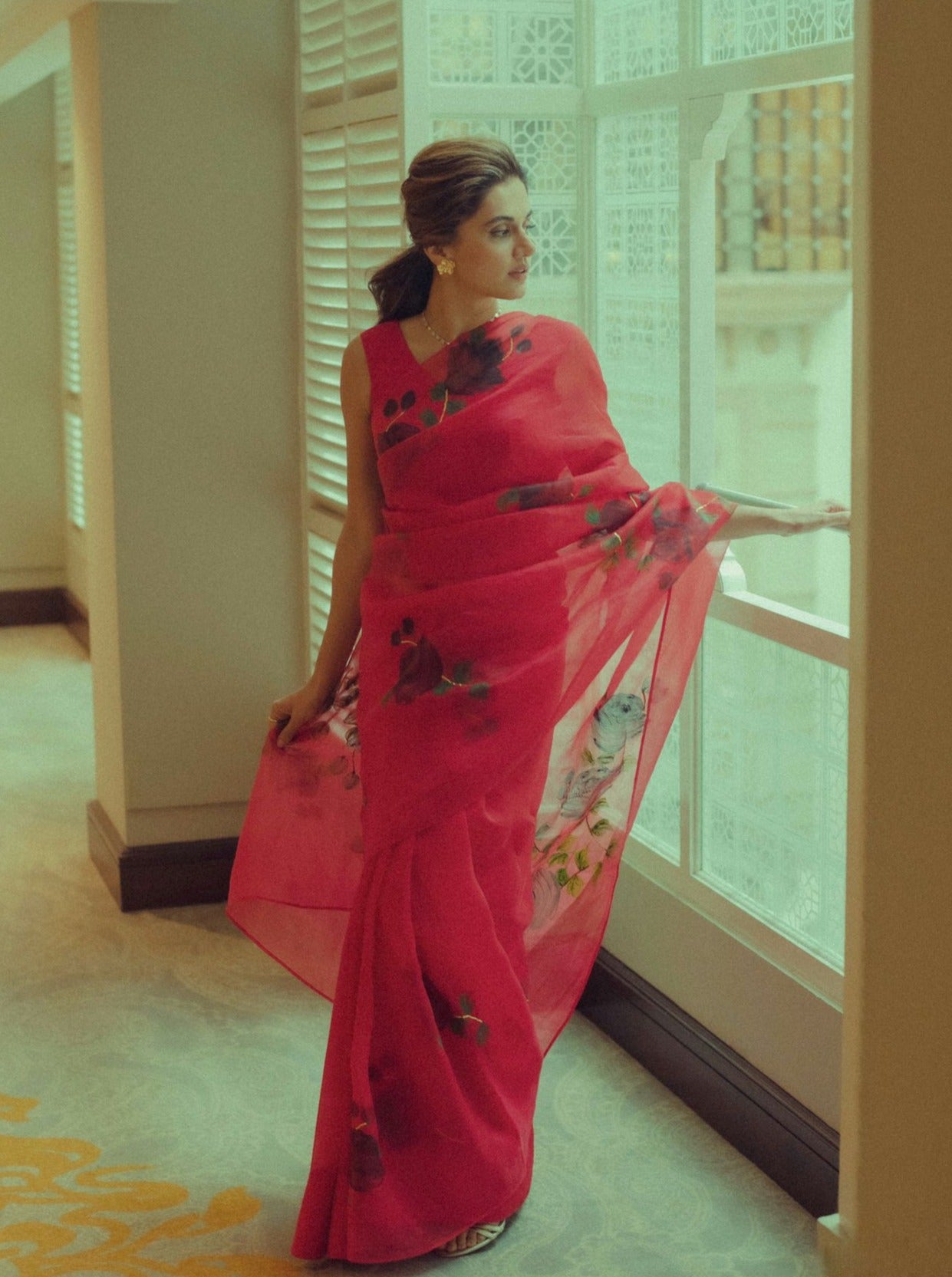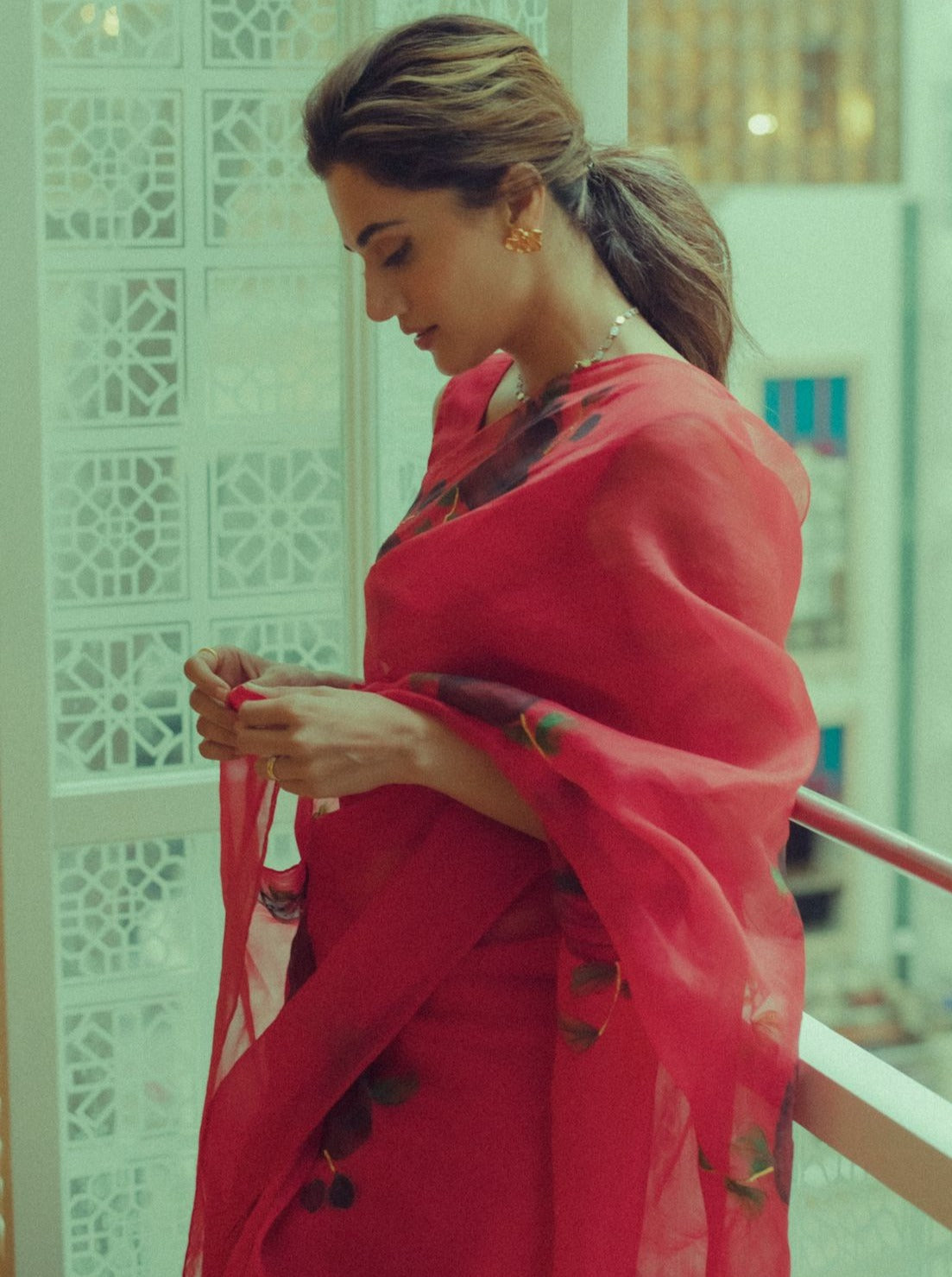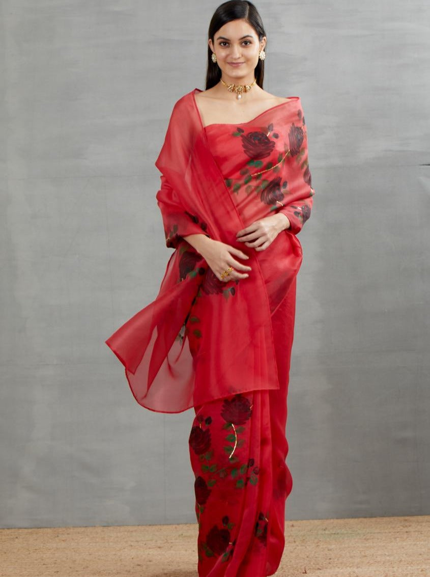 Hand painted pure silk organza saree in red with charcoal black roses enhanced with hand embroidered gota..