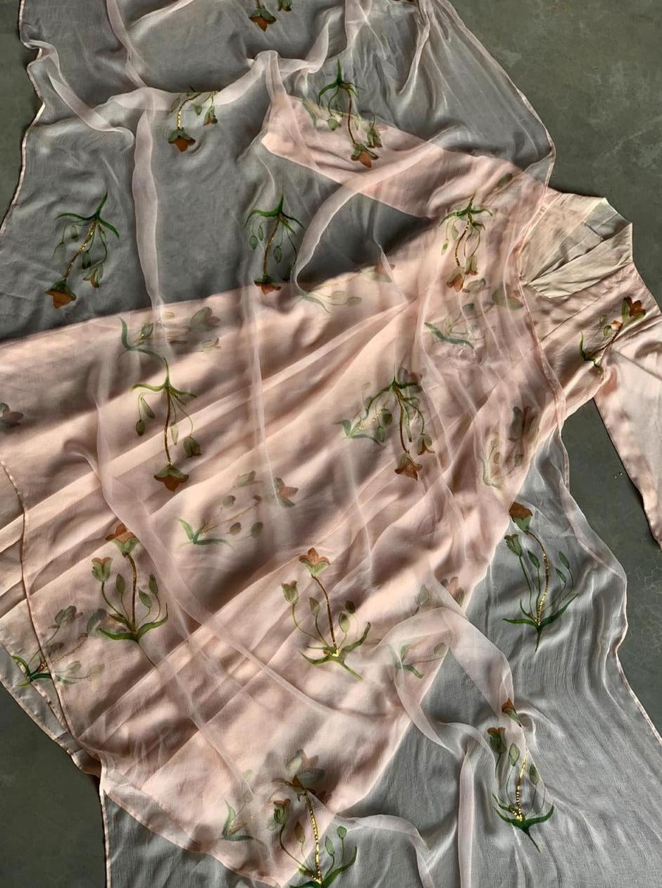 Hand painted Apricot tulips on a Champaign shade silk kurta and chiffon duppata enhanced with hand embroidered gota.