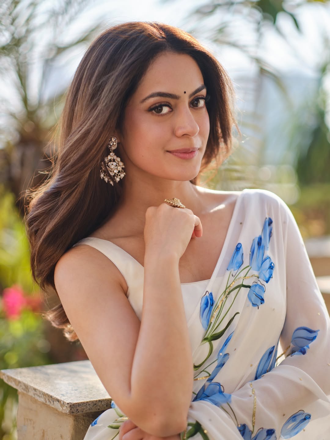 Hand painted blue tulips on an ivory pure flat silk chiffon saree enhanced with hand embroidered gota and sequins .