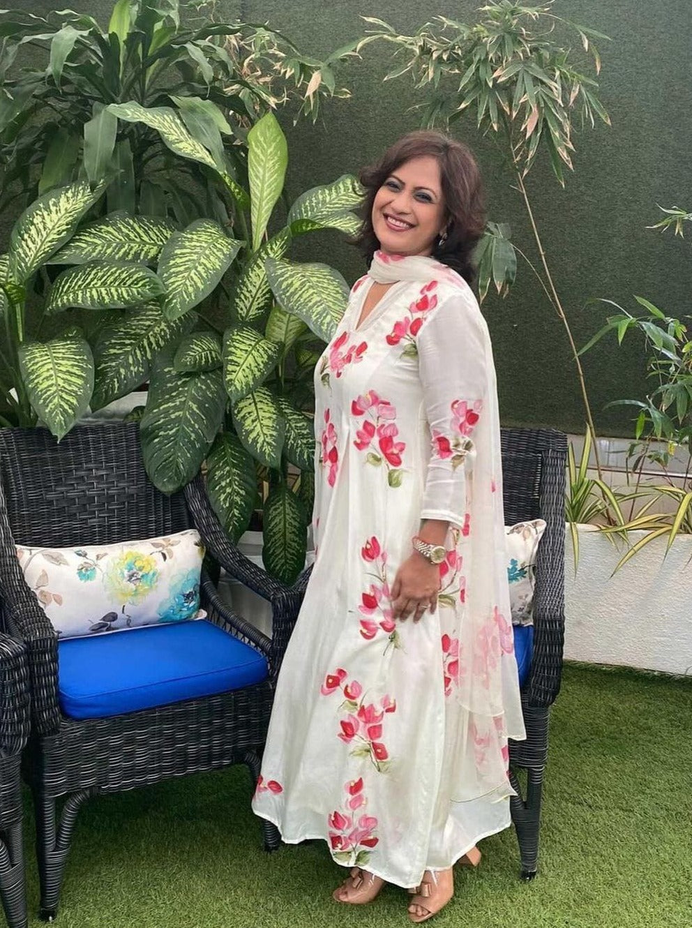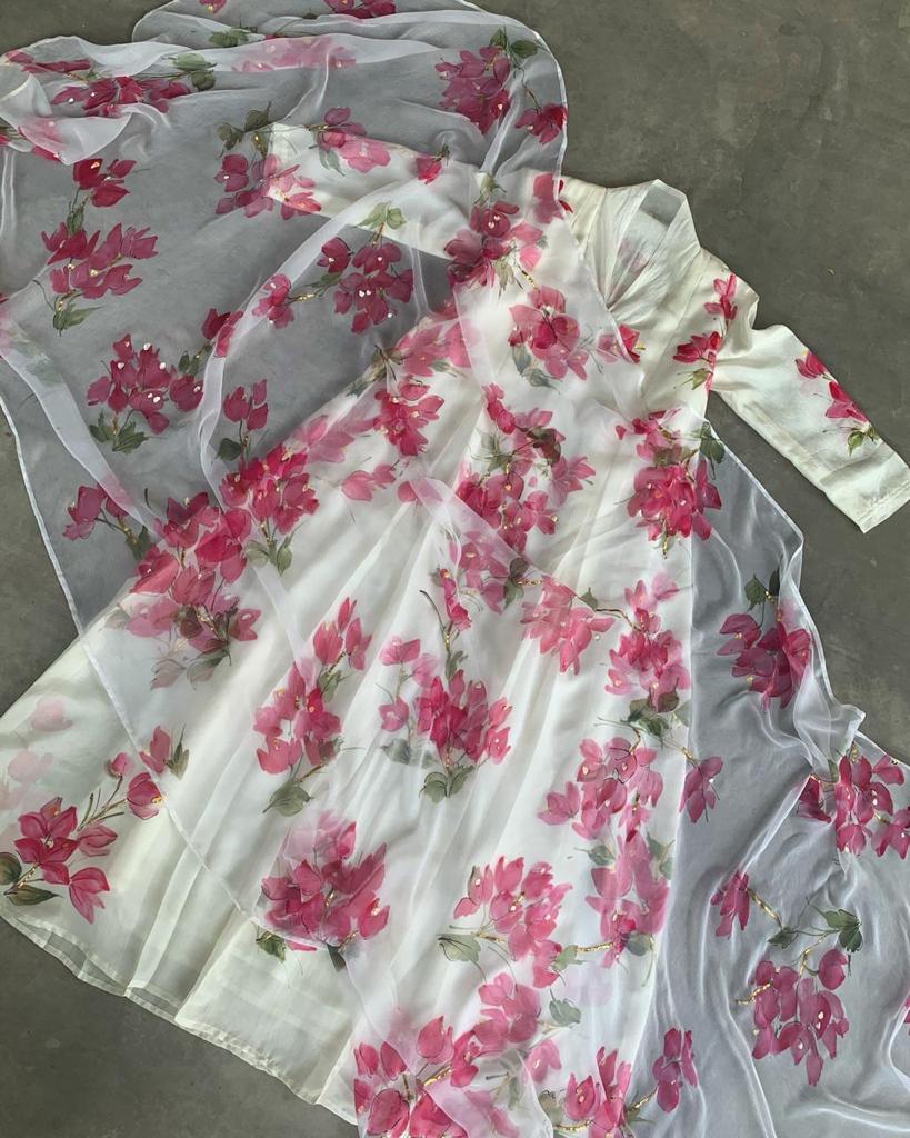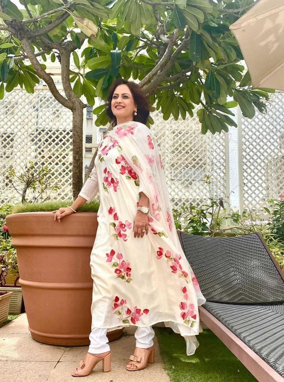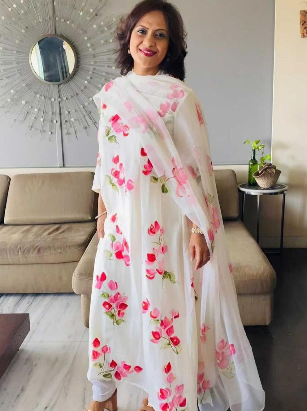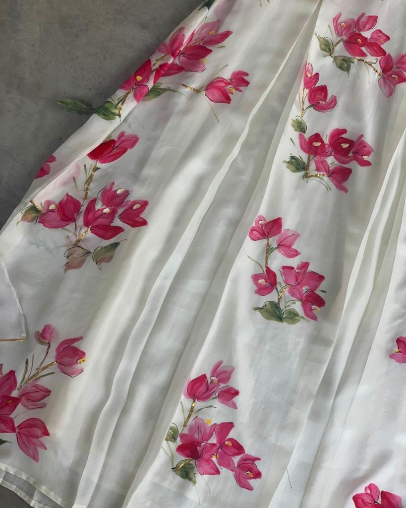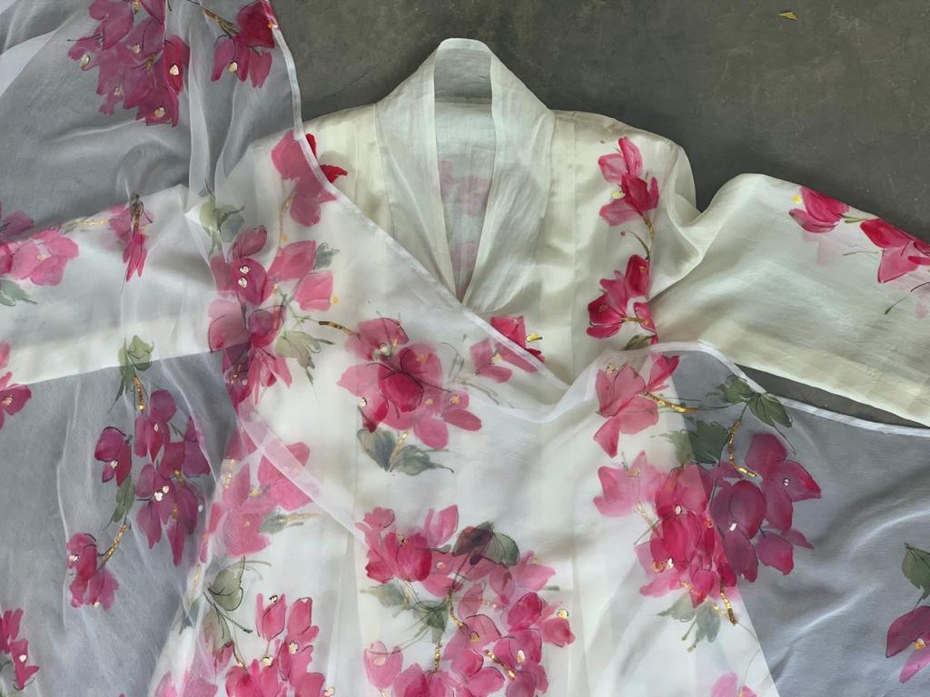 Hand painted Bougainville’s in shades of cherry red on ivory silk kurta and chiffon dupatta enhanced with hand embroidered gota.
