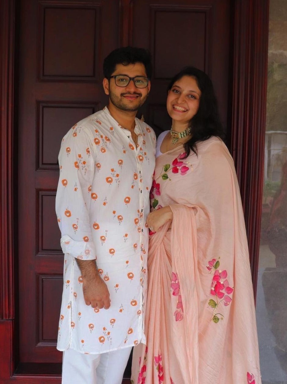 Dry clean only.We use copper (tamba) gota in all their creations, which cannot be washed at home as it might get tarnished or bleed some residual color on the fabric.