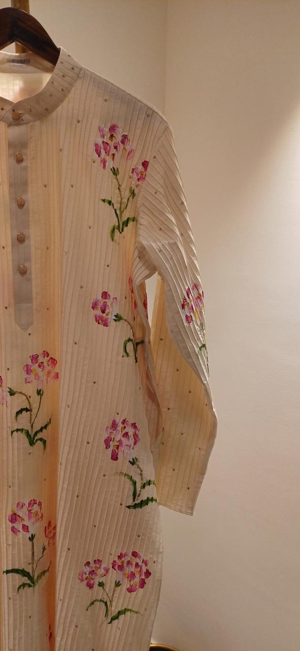 Hand painted carnations on a dull ivory cotton silk Men's kurta enhanced with hand embroidered minimal Sitara’s & pin tucks done on fabric