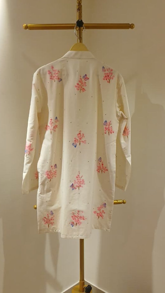 Cherry blossoms hand painted with iridescent butterflies on a dull ivory cotton silk Mens kurta enhanced with Sitara’s all over minimally crafted , & gota highlights on florals