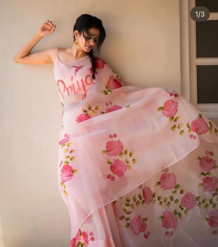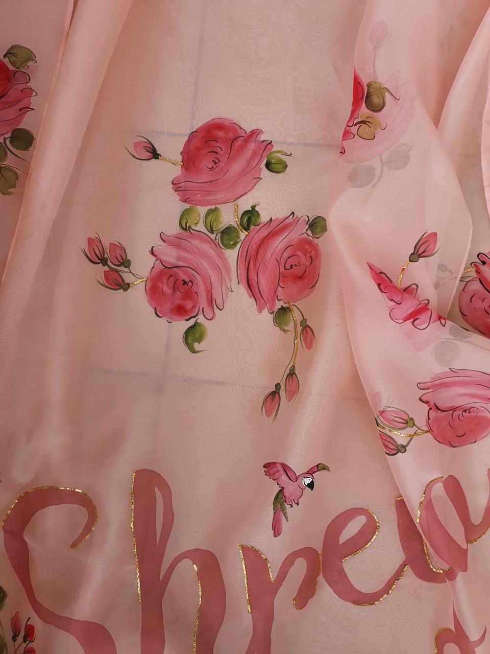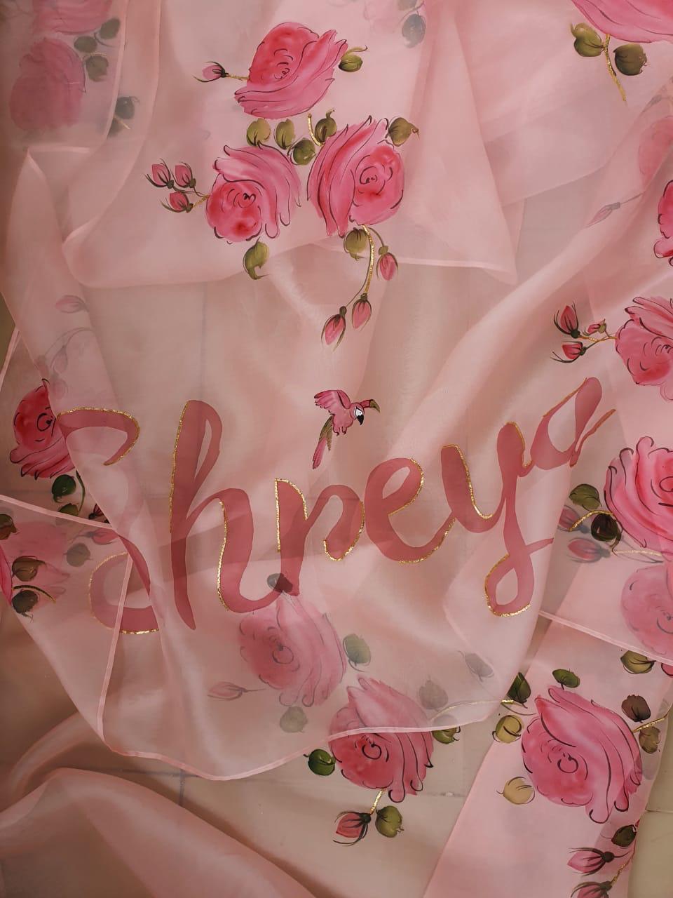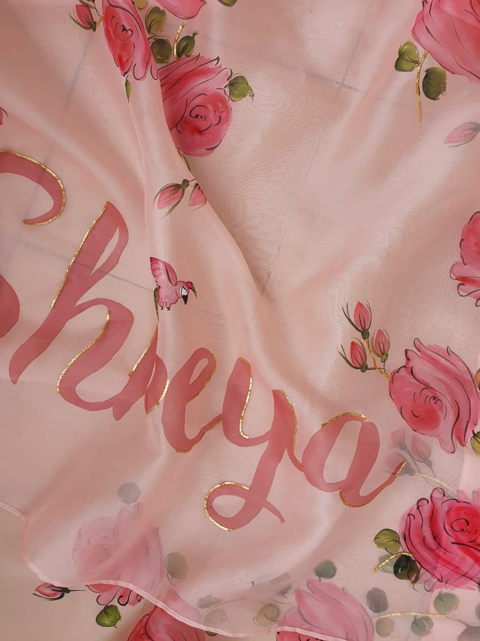 Hand painted Rosepink silk organza saree with custom name painted on it, enhanced with hand embroidered gota