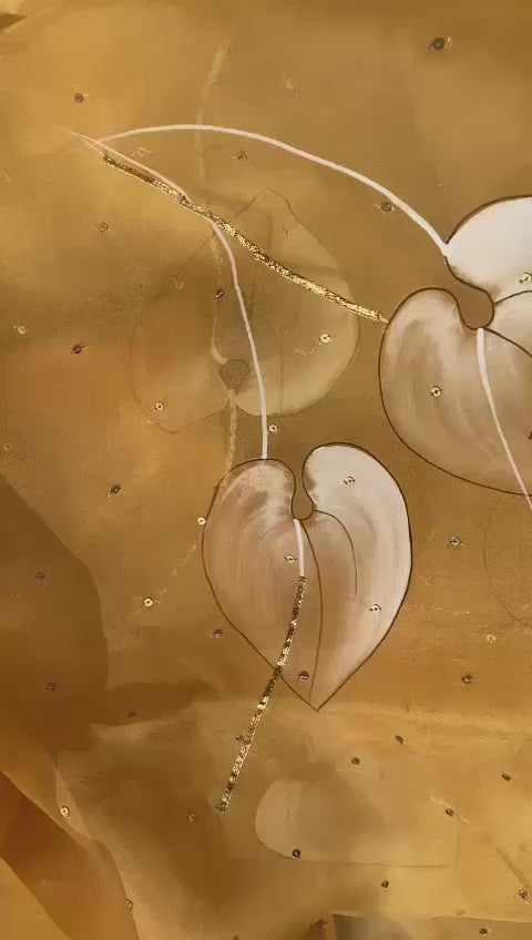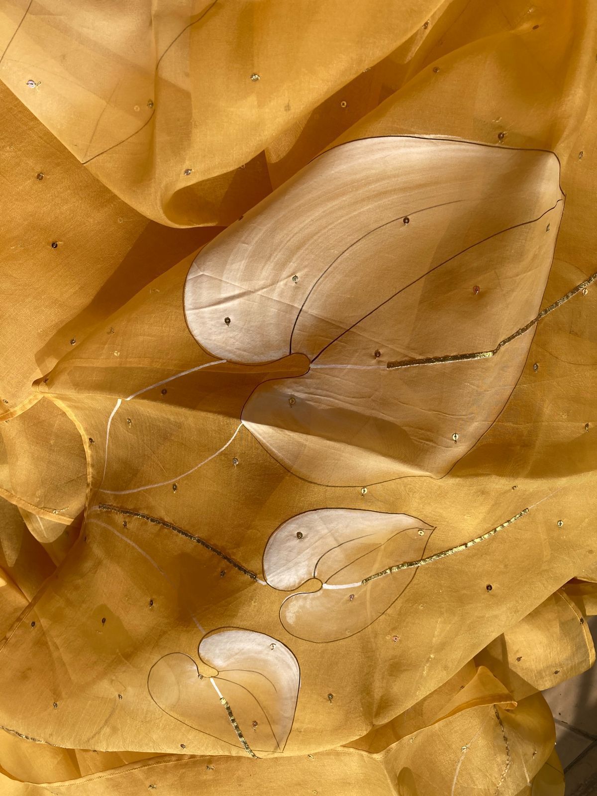 Hand painted white flamingo's on pure silk organza saree with hand embroidered gota enhancement on flowers , sequins embroidery enhancement all over along with gota border.