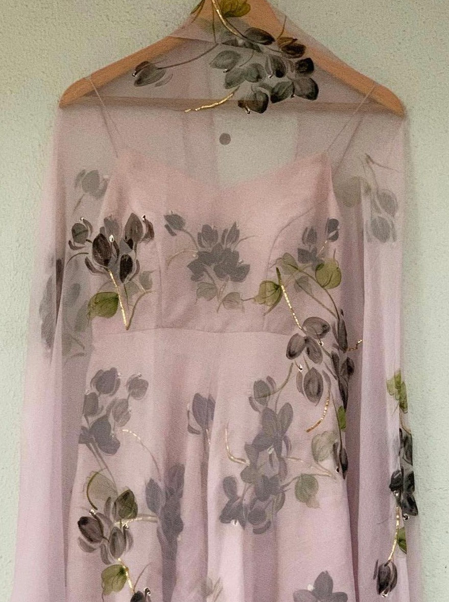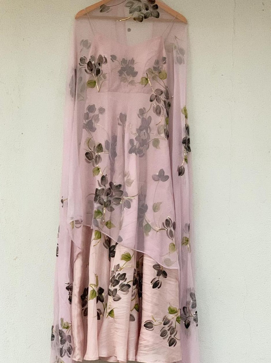 Hand painted charcoal black bouganville’s on lilac silk flaired kurta with duppata enhanced with hand embroidered gota.