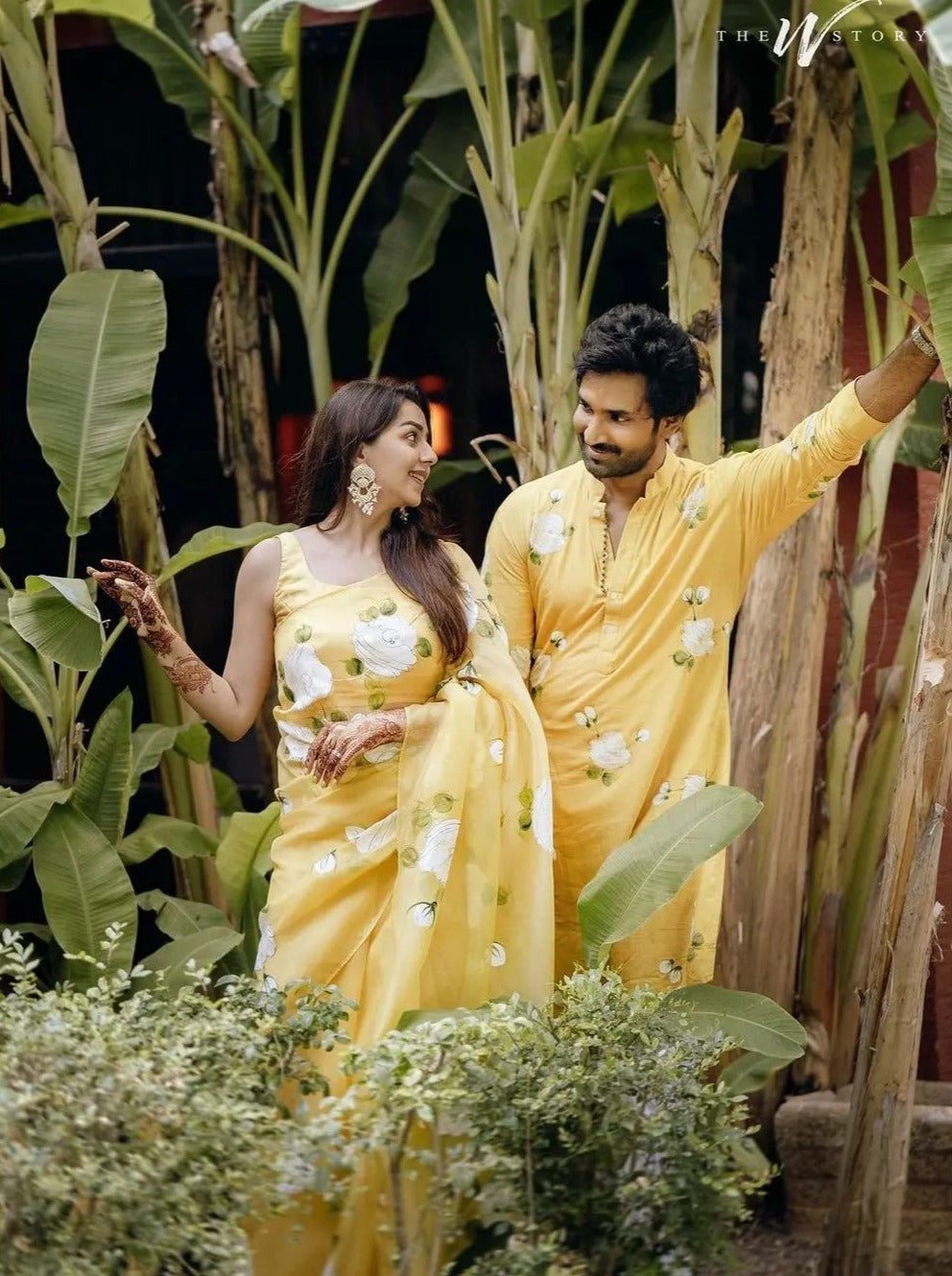 Hand painted white roses on a Yellow shade pure silk organza saree enhanced with hand embroidered gota.